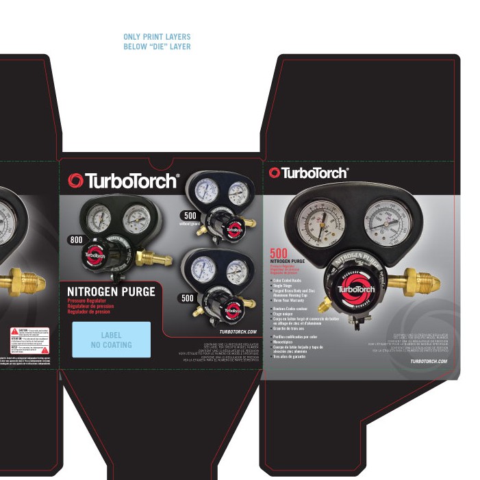 Redesign packaging artwork for the TurboTorch 500-800 Nitrogen Purge Pressure Regulator